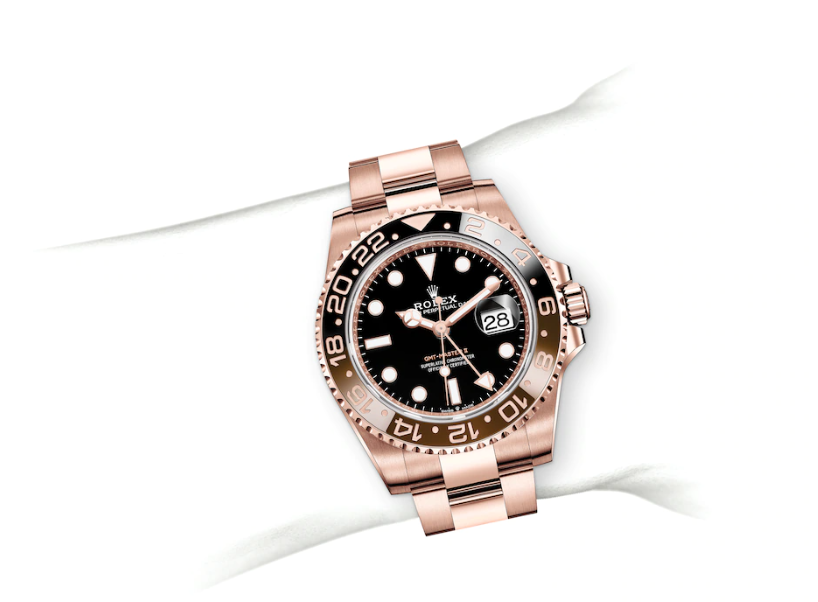 In addition to conventional hour, minute and seconds hands, the GMT-Master II features an arrow-tipped hand, which circles the dial once every 24 hours, as well as a bidirectional rotatable 24-hour graduated bezel. The distinctively coloured 24-hour hand displays the “home” reference time in a first time zone which can be read on the graduations on the bezel. The traveller’s local time is easily set by “jumping” from hour to hour, thanks to an ingenious mechanism operated via the winding crown: the hour hand can be adjusted forwards or backwards independently of the minute and seconds hands. This allows travellers to adapt to their new time zone without affecting the precision of their timekeeping.
