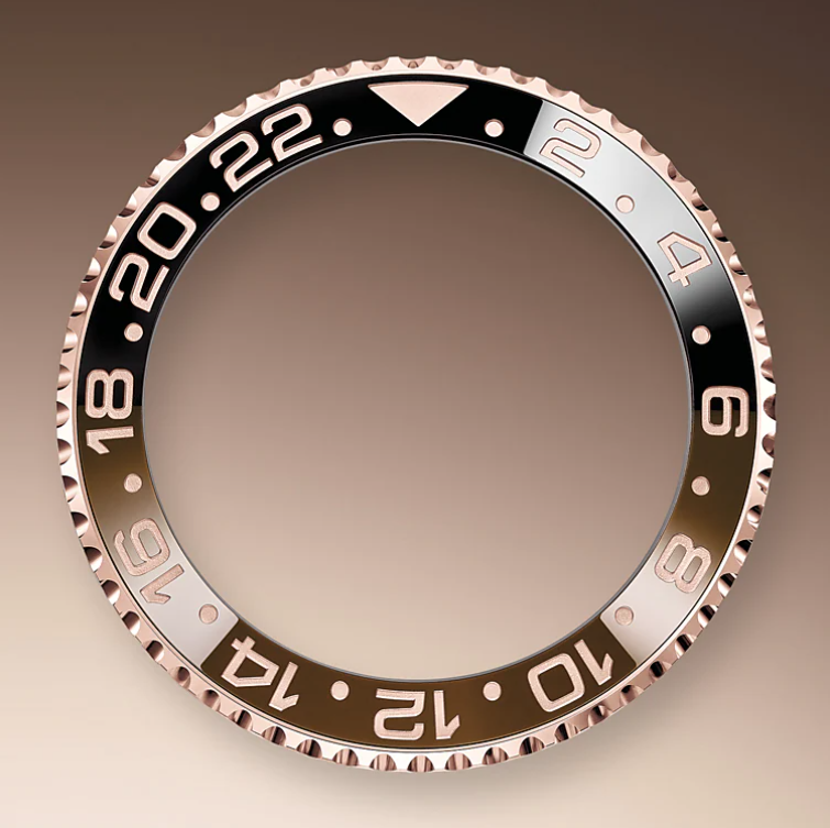 Bidirectional rotatable 24-hour graduated bezel. Two-colour brown and black Cerachrom insert in ceramic, moulded numerals and graduations